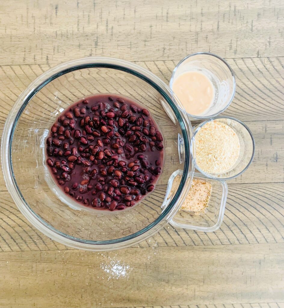3. Add the egg replacer, 2 tsp of seasoned salt and 1/2 cup of breadcrumbs to black beans and mix until combined.